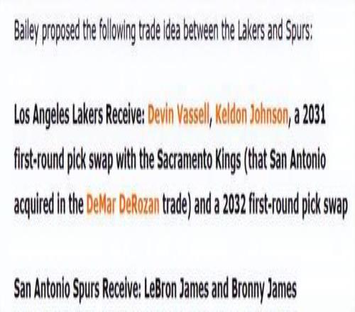 “湖人送出詹姆斯+布朗尼,换到瓦塞尔、凯尔登·约翰逊,外加两个未来首轮互换权。”