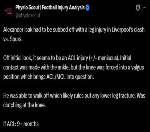 赛后,知名足球伤病分析博主Physio Scout在社交媒体上对伊萨克的伤情进行了初步分析。他写道:“在利物浦对阵热刺的比赛中,亚历山大·伊萨克因腿伤被换下。 初步判断,似乎是前交叉韧带(ACL)损伤(+/-半月板损伤)。最初是脚踝受伤,但膝盖被迫外翻,这使得前交叉韧带/内侧副韧带(MCL)损伤的可能性变得难以确定。 他能够自行离开,这很可能排除了小腿骨折的可能性。他当时一直捂着膝盖。 如果是前交叉韧带损伤:9个月以上。”