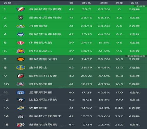 北京时间1月17日,我们看看NBA西部的最新排名,所有球队至少进行了39场比赛,火箭和湖人进行的场次是最少的,鹈鹕打了44场比赛是最多的!