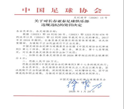 中国足协发布涉“假赌黑”问题处罚:长春亚泰被罚20万,扣除联赛积分4分