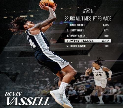 瓦塞尔超越鲍文!升至马刺队史三分榜第四位 -