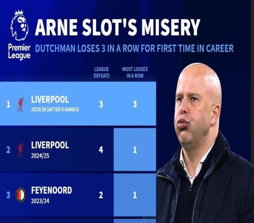 德转:斯洛特生涯首次遭遇联赛三连败,此前五个赛季从未连败 -