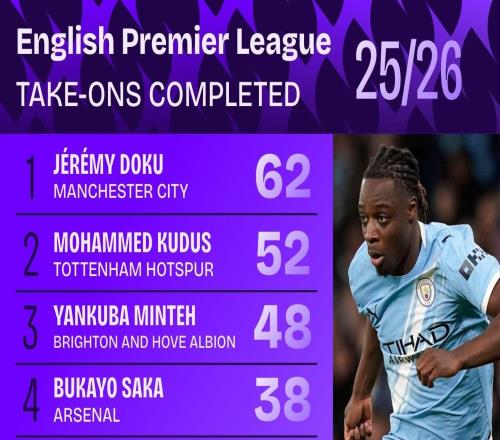 本赛季英超成功过人排名:多库62次居首,库杜斯次席 -