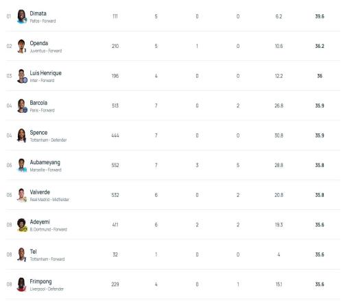 39.6kmh,帕福斯前锋迪马塔断层领先欧冠冲刺速度排行榜 -